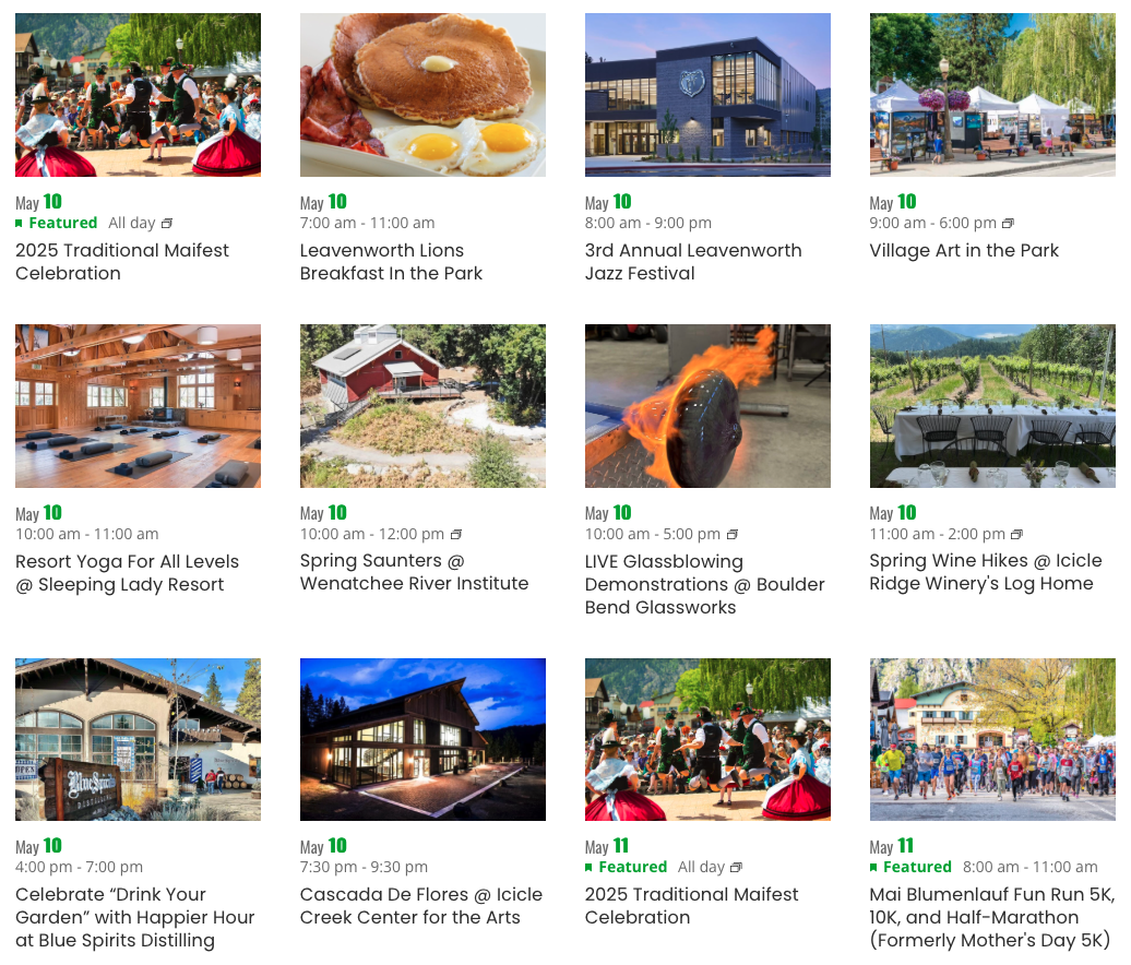 8 AM: Mai Blumenlauf 5k/10k/Half Marathon May Flower Run (formerly known as Mother’s Day 5k). Proceeds benefit Cascade Medical Foundation and Cancer Research. Please visit here for registration and more details: https://www.teddriven.com/leavenworth-mai-blumenlauf
