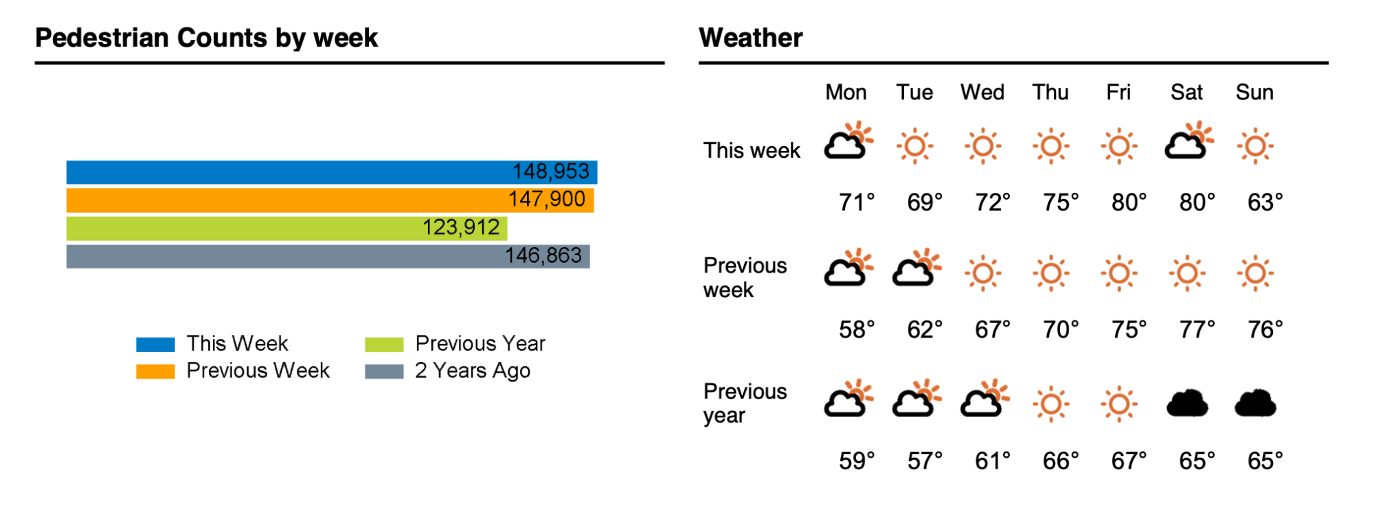 Footfalls have seen a decline in the last few months, at times a 10-20% reduction over the previous year. However, sunshine has been helping, and May is trending in a better direction. A new addition to the Bulletin will be these weekly reports to help you gauge visitation to the village in this already tumultuous year.